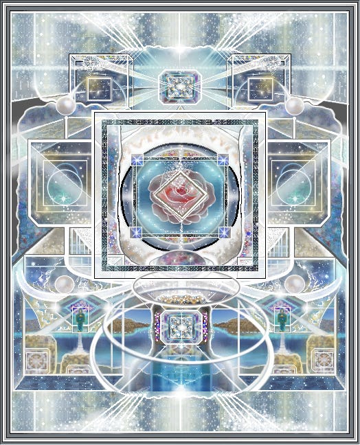 Starting at the top, the rounded cube in the center symbolizes Name’s agapé light and the exquisite light-fold between Name and Word. It also symbolizes the pan-diamond room in the story, as do the diamond shapes in front of the rose (besides symbolizing the three types of appearances on another level), and the same rounded cube in the head of the figure on the bottom.